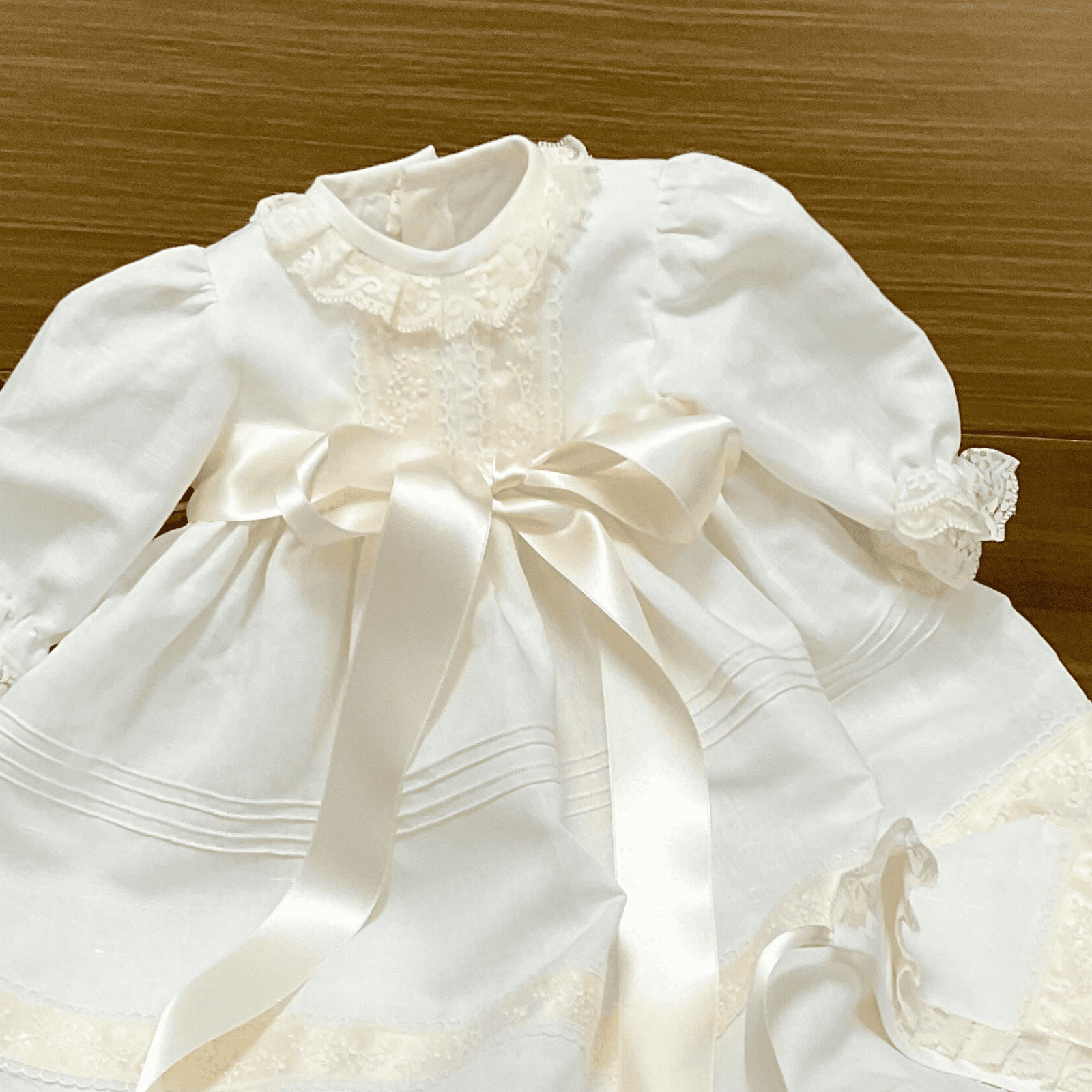 El batón de bebé es de lino en un suave tono beige, con delicados adornos en color marfil y un entredós que añade un toque de elegancia.