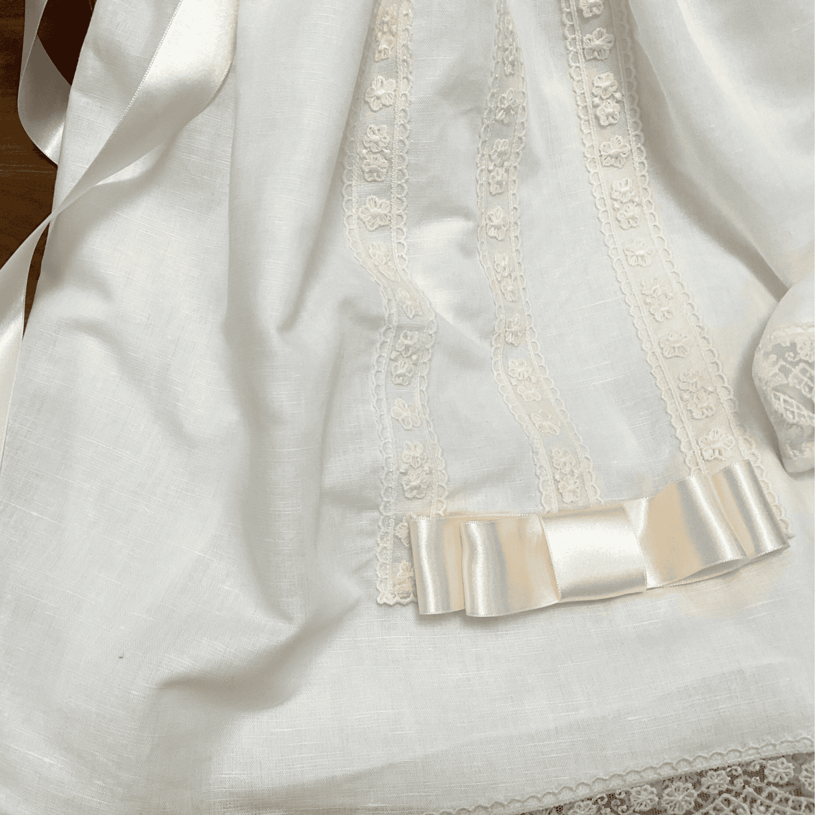 Baton de marfil con delicados adornos de encaje en la parte delantera y elegantes lazos de raso en los laterales.