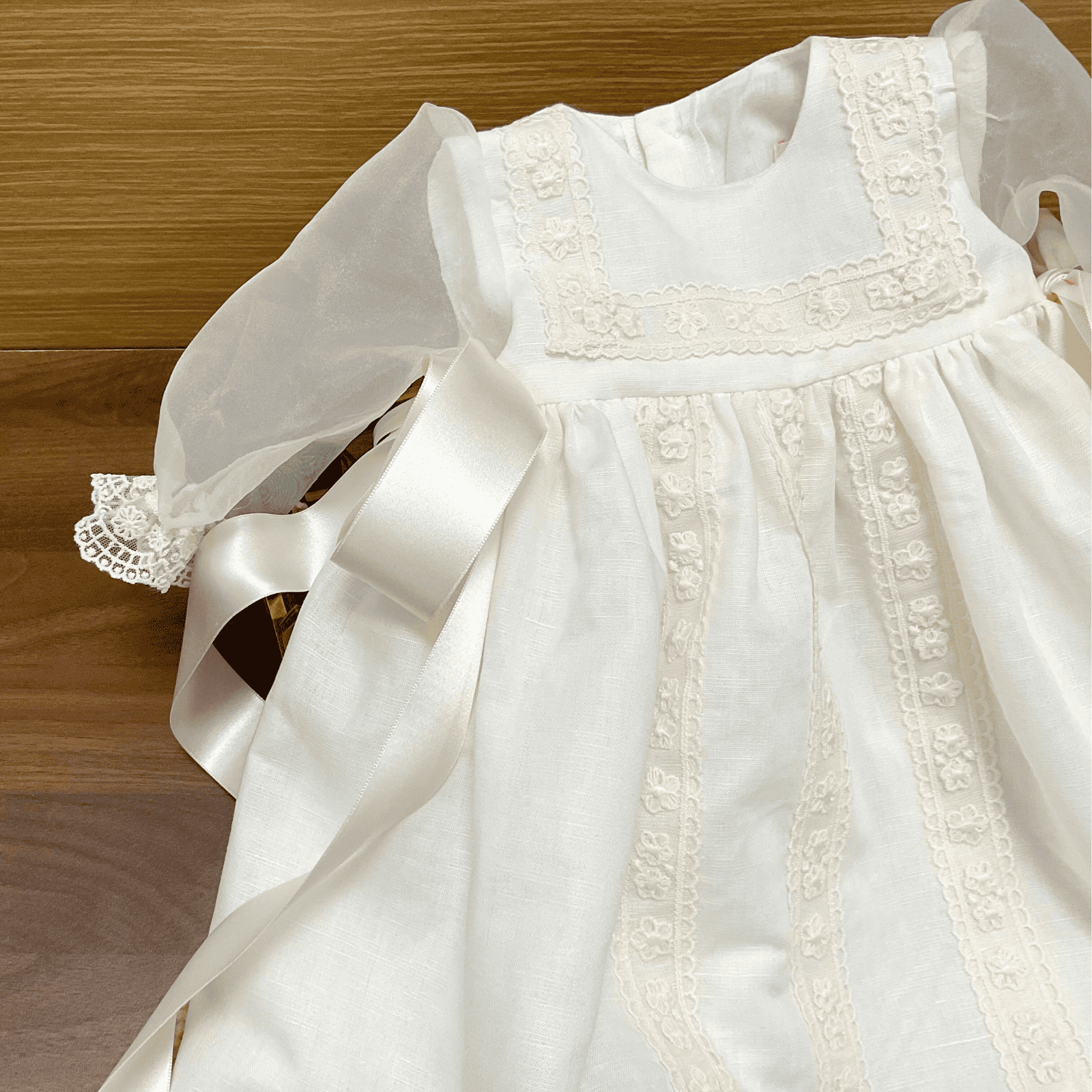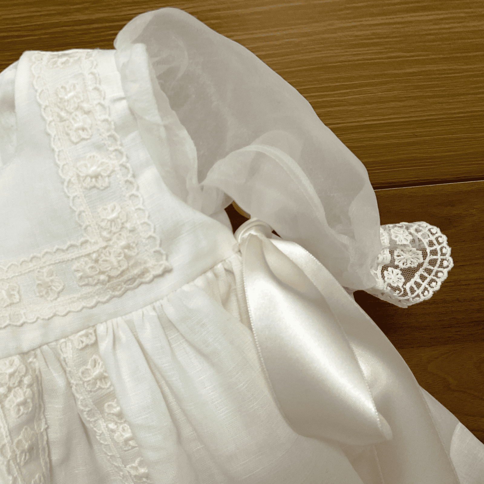 El batón de marfil presenta un diseño elegante y delicado. Su color marfil resalta la sofisticación de los adornos de encaje en la parte delantera, que añaden un toque de intrincado detalle y gracia. A ambos lados, se encuentran lazos de raso, que aportan un contraste sutil con la suavidad del encaje. Este batón se caracteriza por su belleza y elegancia, ideal para ocasiones especiales o eventos formales.