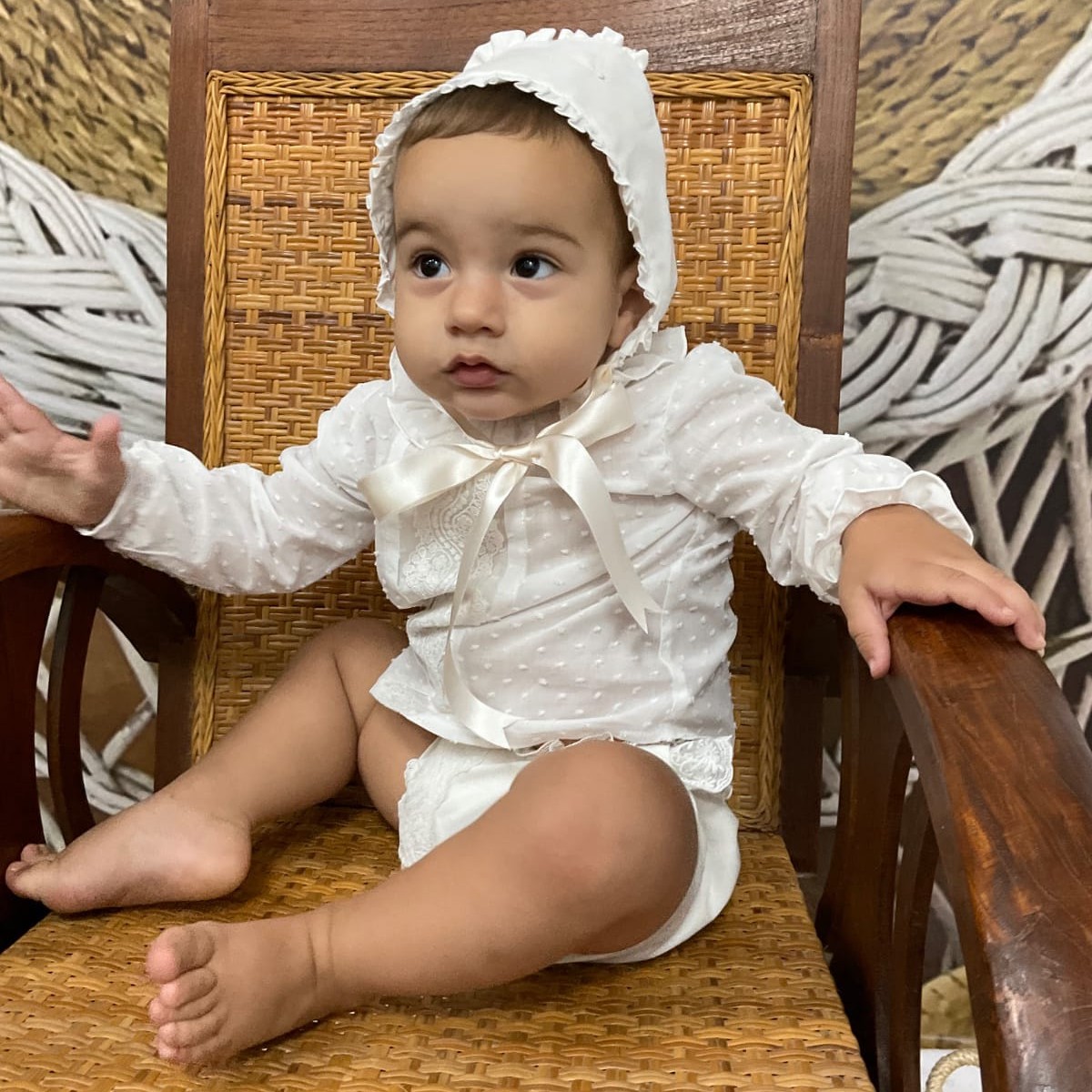 Conjunto compuesto por una blusa de manga larga de plumeti marfil y una braguita marfil con panetitos en camel, a juego con una capota del mismo tono, adornado con bonitos encajes y puntas. Elegante y fino, perfecto para ocasiones especiales como ceremonias.