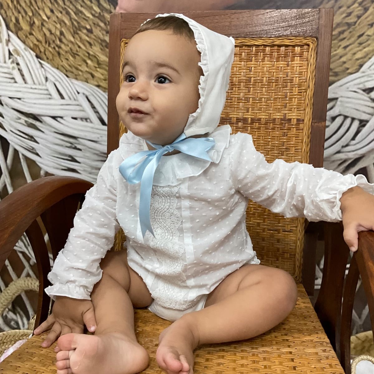 Conjunto compuesto por una blusa de manga larga de plumeti marfil y una braguita marfil con panetitos en celeste, a juego con una capota del mismo tono, adornado con bonitos encajes y puntas. Elegante y fino, perfecto para ocasiones especiales como ceremonias.
