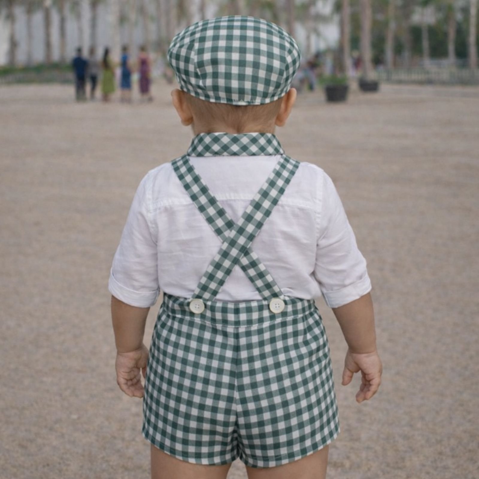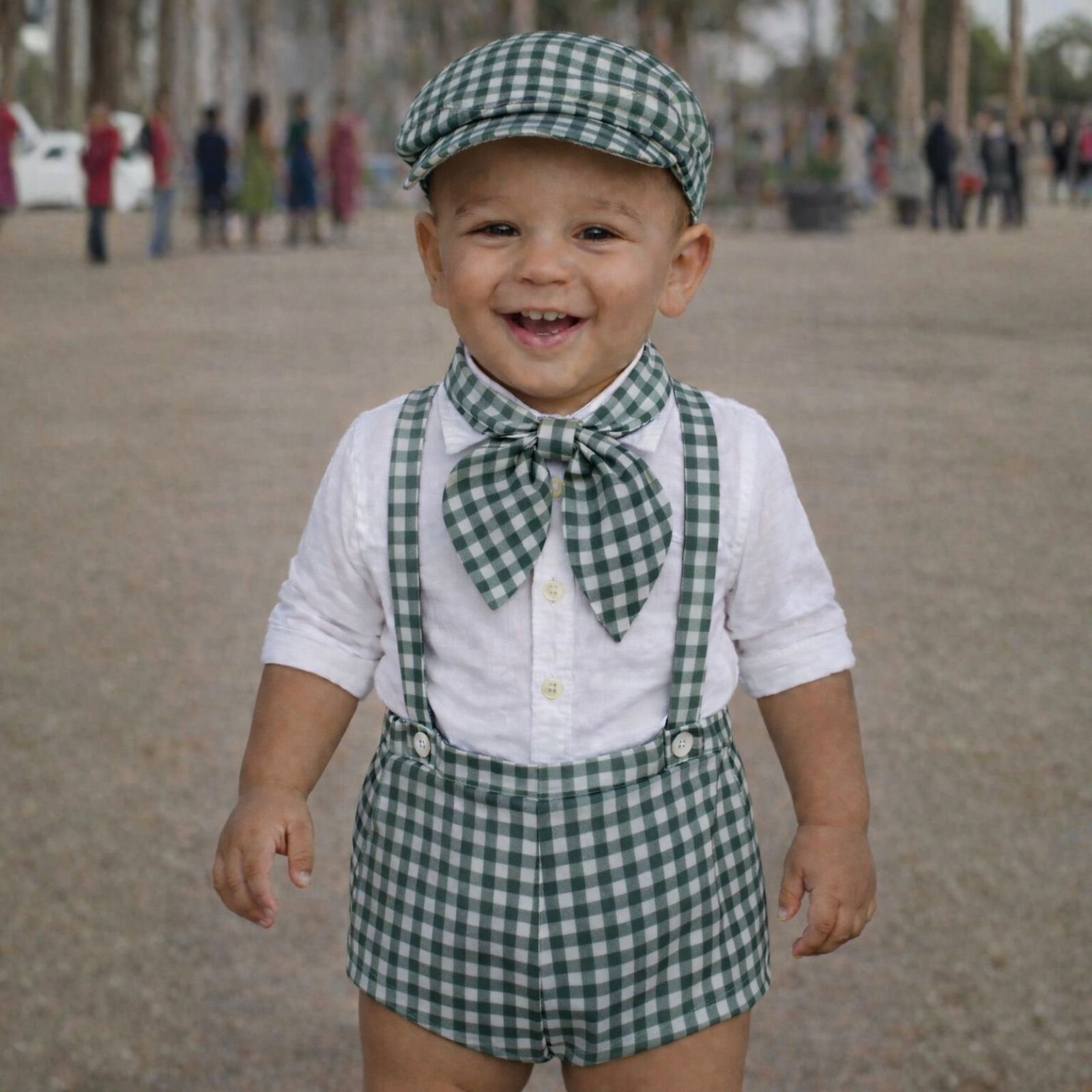 Conjunto infantil tradicional ideal para ferias y romerías. Compuesto por pantalón corto verde vichy con tirantes a juego, camisa blanca de manga corta y gorra, este look es perfecto para vestir a los más pequeños en días de celebración.