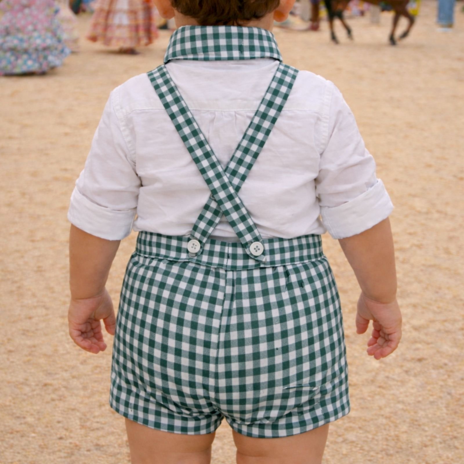 Conjunto infantil tradicional ideal para ferias y romerías. Compuesto por pantalón corto verde vichy con tirantes a juego, camisa blanca de manga corta, este look es perfecto para vestir a los más pequeños en días de celebración.