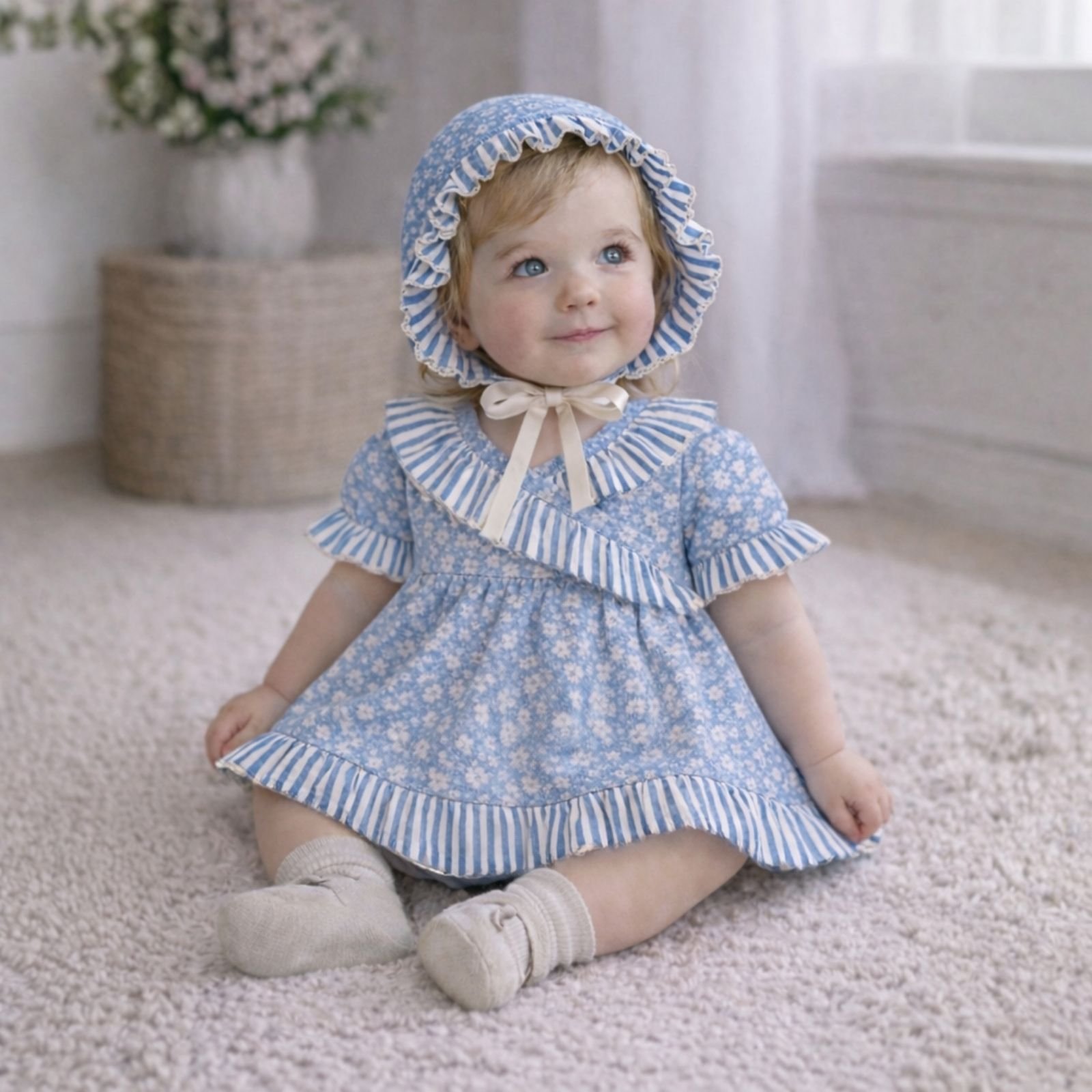 Incluye una capota a juego, con volante de rayas y lazo en tono crudo, que completa el look con un aire tradicional y encantador, ideal para ocasiones especiales o eventos familiares y braguita.
