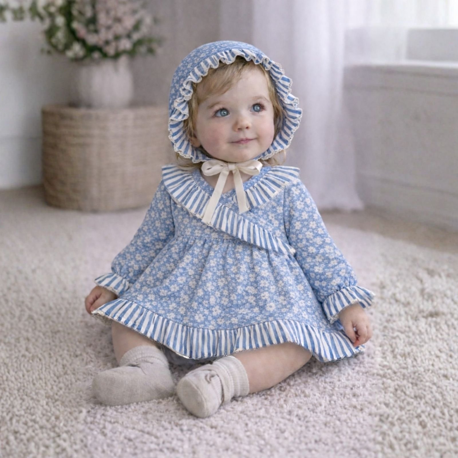 Incluye una capota a juego, con volante de rayas y lazo en tono crudo, que completa el look con un aire tradicional y encantador, ideal para ocasiones especiales o eventos familiares y braguita.