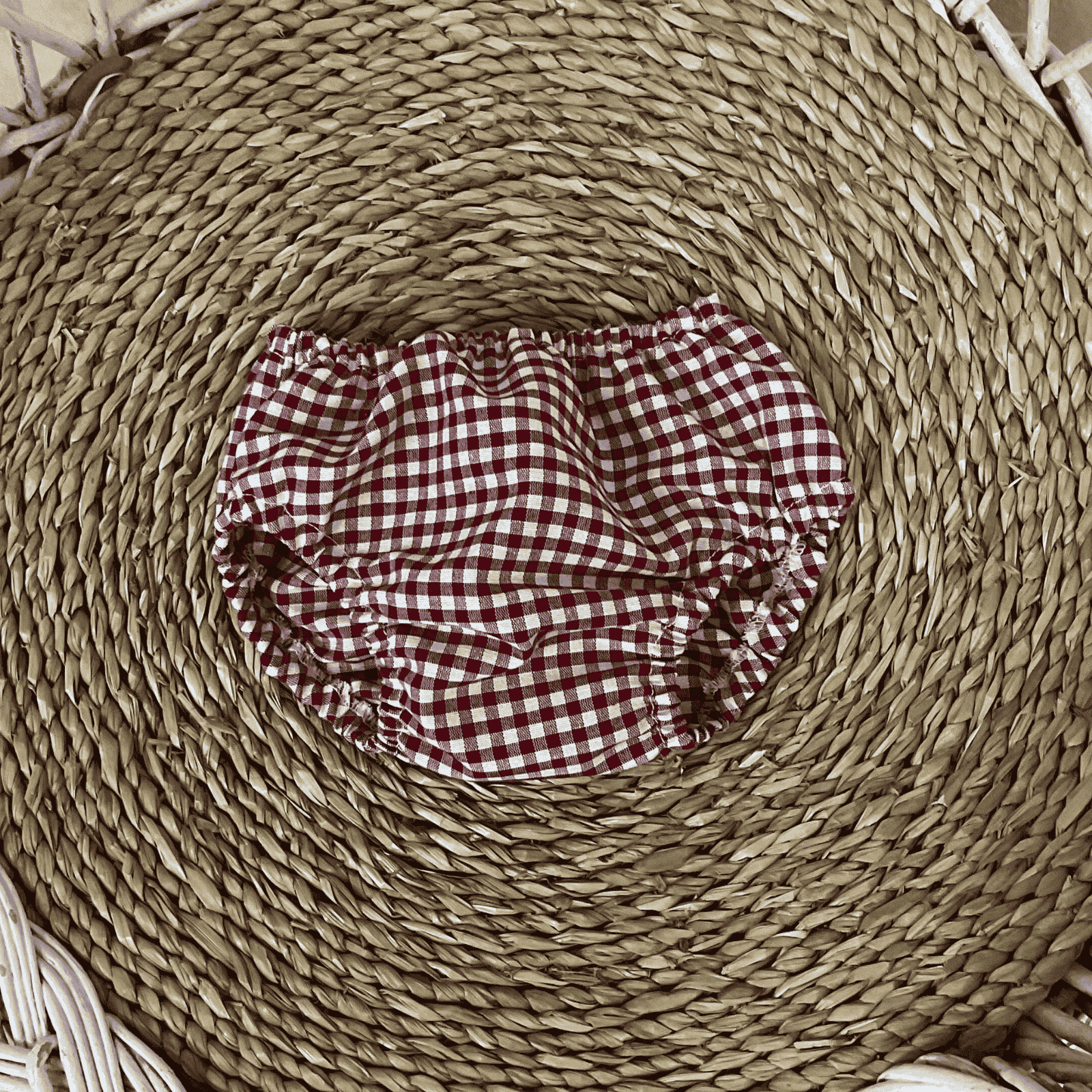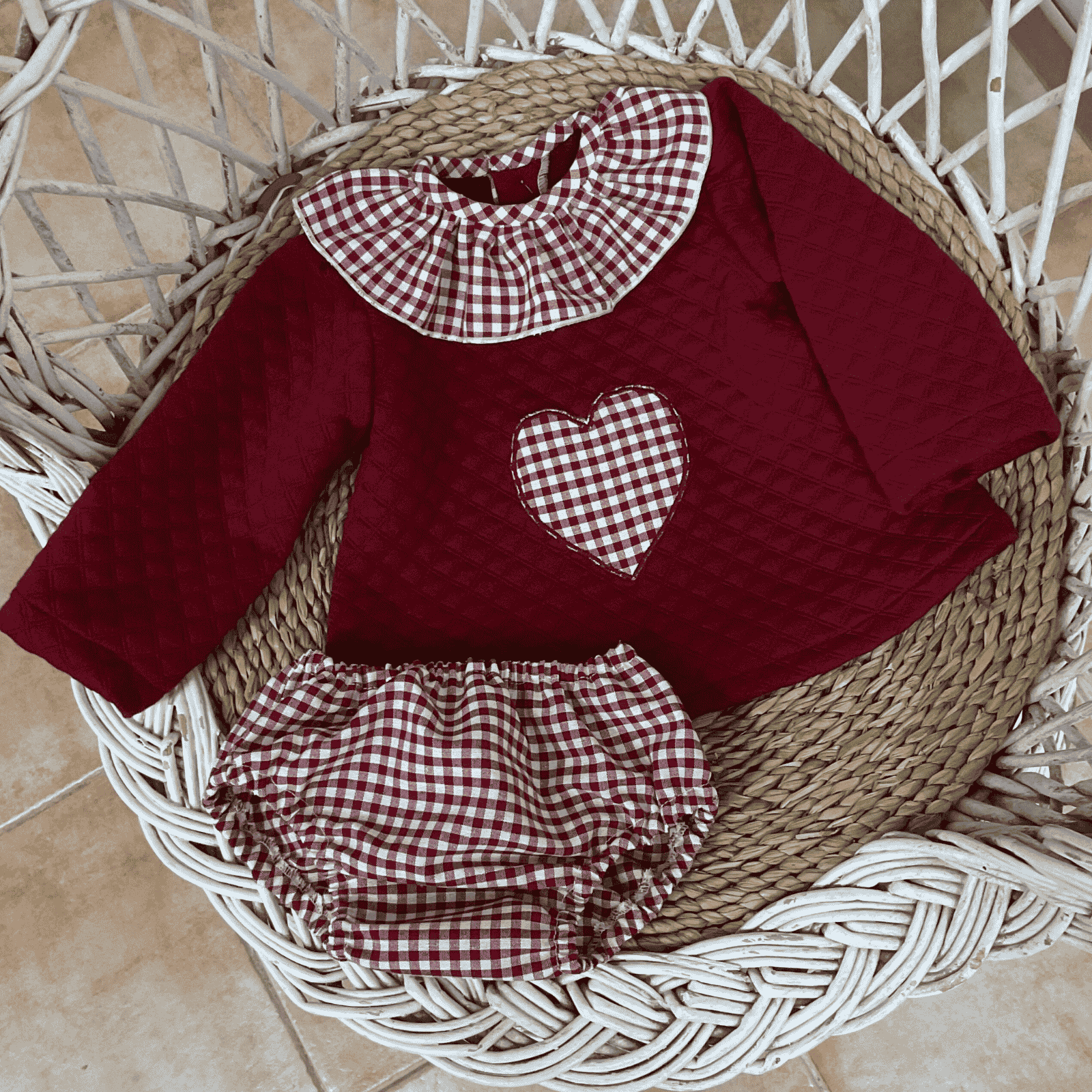 El jesusito corazón está confeccionado en un tejido acolchado de tono burdeos, con una composición de 97% poliéster y 3% spandex que aporta suavidad, calidez y una textura agradable al tacto. Combina además un delicado tejido de cuadros vichy en burdeos, elaborado con un 80% de algodón y un 20% de poliéster, que realza su estilo clásico y refinado.