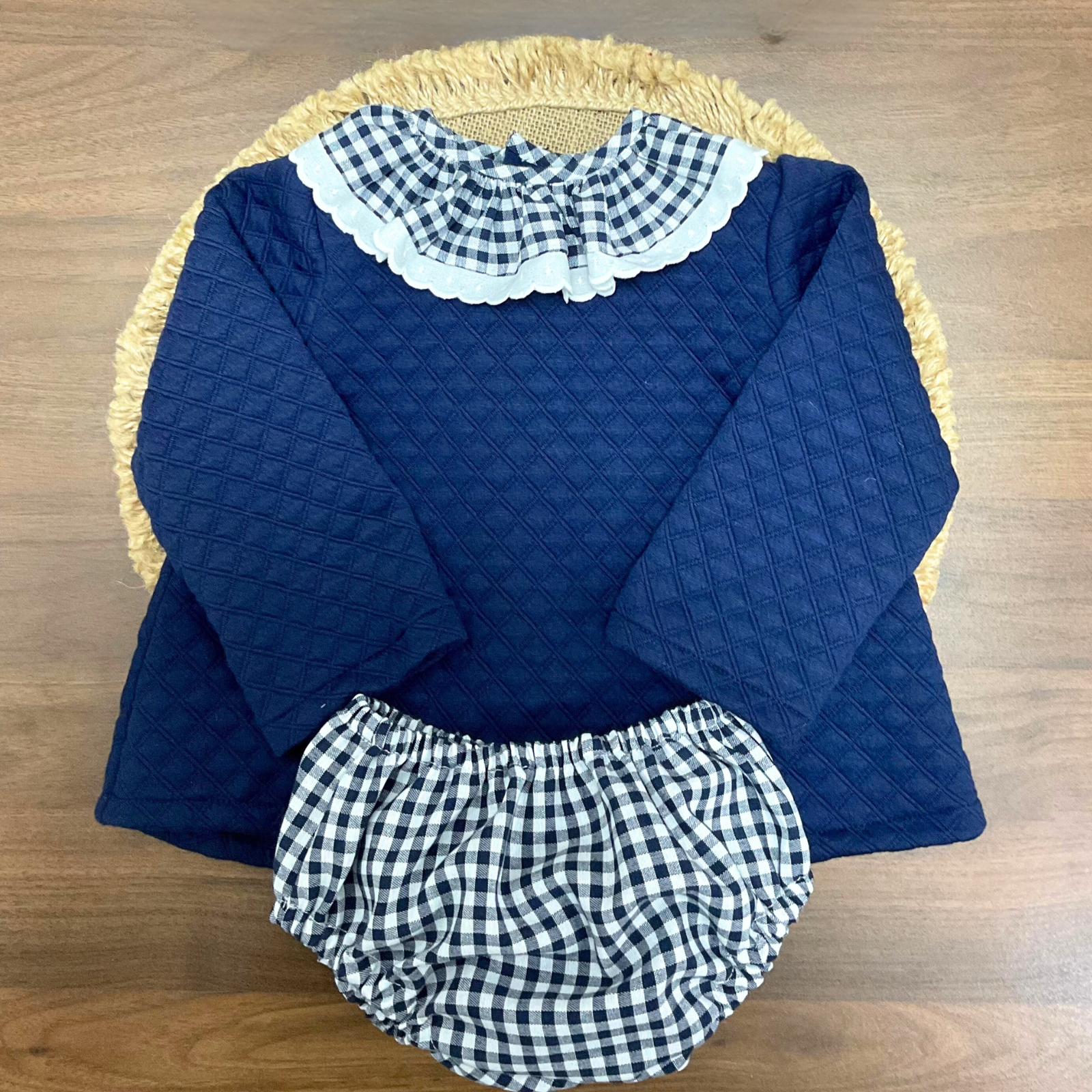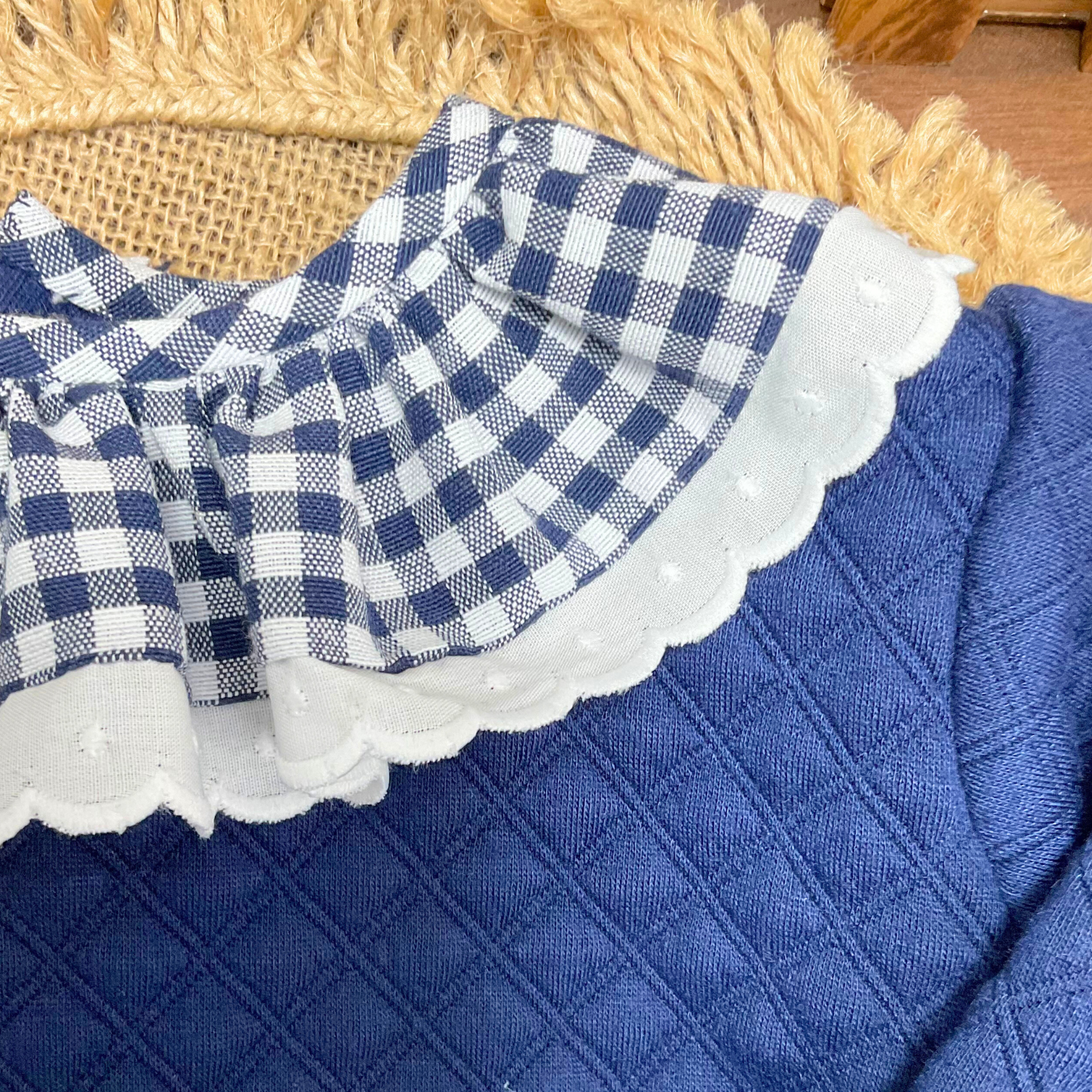 Modelo Ghana, está confeccionado en un tejido acolchado de tono azul marino, con una composición de 97% poliéster y 3% spandex que aporta suavidad, calidez y una textura agradable al tacto. Combina además un delicado tejido de cuadros vichy en azul marino, elaborado con un 80% de algodón y un 20% de poliéster, que realza su estilo clásico y refinado, con un detalle en plumeti blanco 100% algodón.
