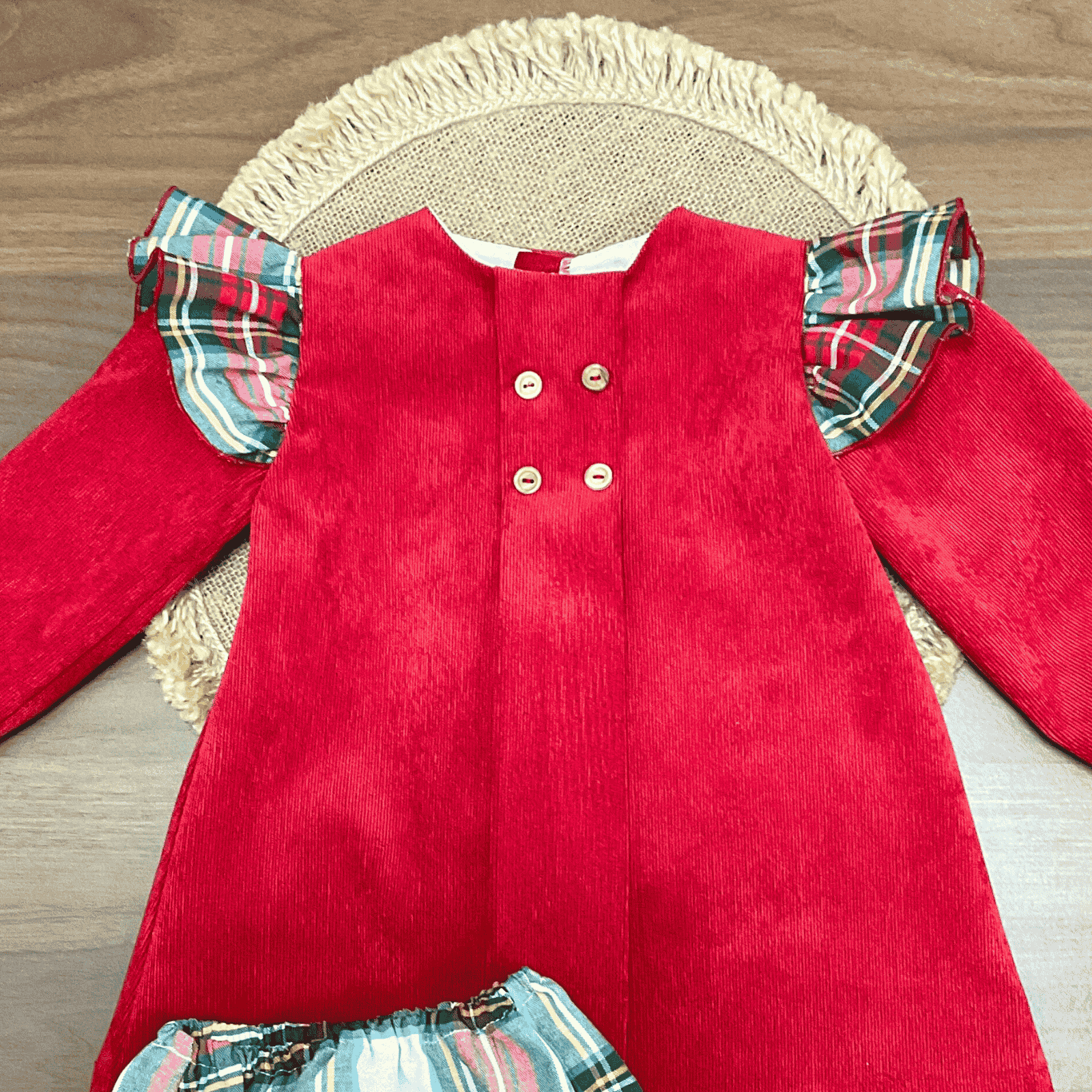 Confeccionado en un suave tejido de pana fina en tono rojo, destaca por su estilo clásico y cálido. En los hombros, incorpora unos volantes de cuadros tartán en tonos rojos, verdes y azulados que aportan contraste y un aire festivo irresistible.