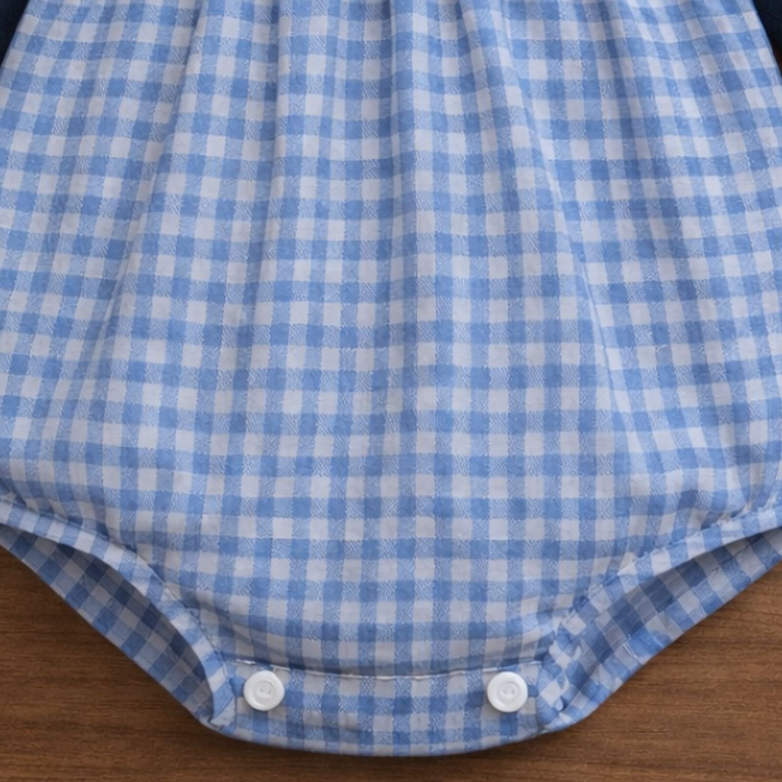 Confeccionado en un suave tejido acolchado en tono azul marino. Su composición de 97% poliéster y 3% spandex aporta calidez, elasticidad y una textura agradable al tacto. Combina delicadamente con un tejido de cuadros vichy en celeste, elaborado con 80% algodón y 20% poliéster, que añade un toque clásico y encantador al conjunto.