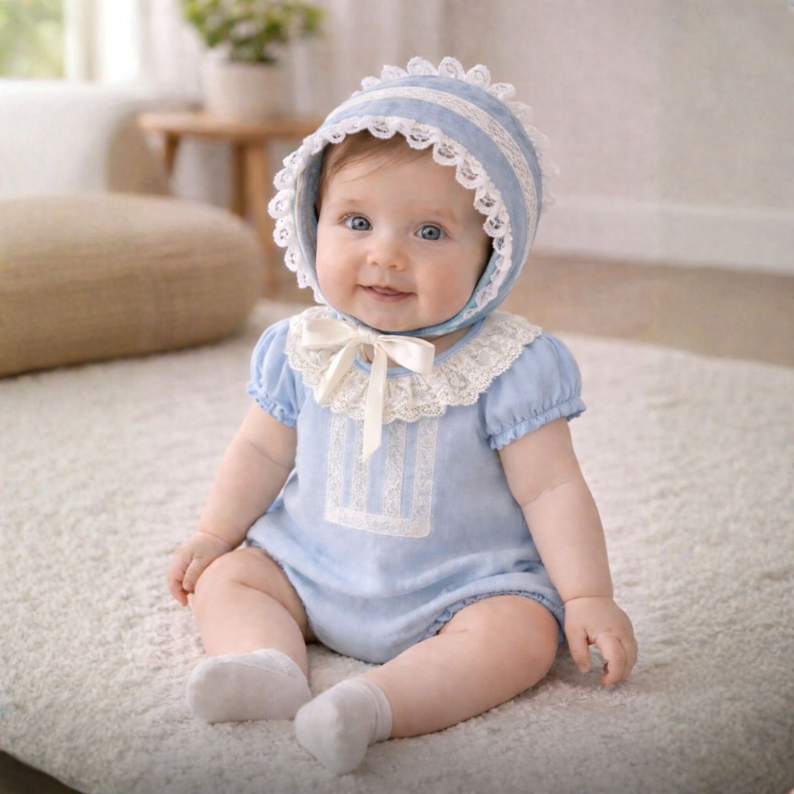 Se acompaña de una capota a juego, adornada con encaje, que completa el conjunto con un aire tradicional y encantador.