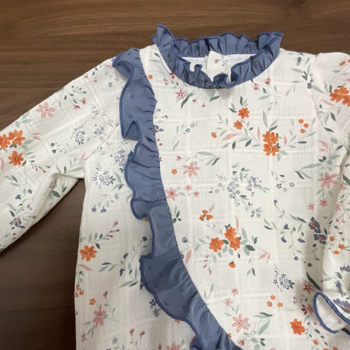 Pelele con tejido estampado con mangas largas. Como adorno lleva un volante de plumeti cruzado en la parte de delante. Abotonado en la espalda.
