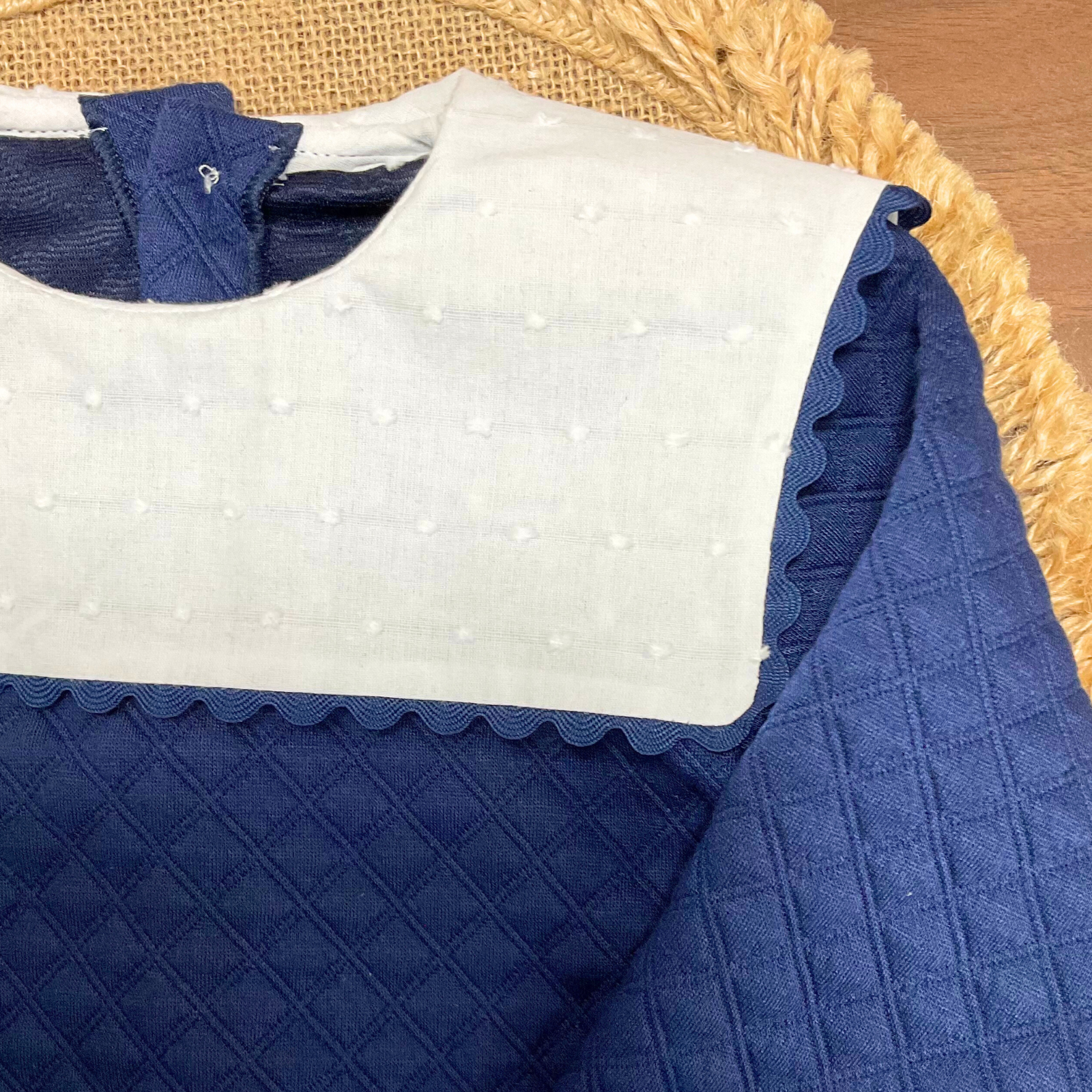 Pelele de vestir para bebé, modelo Uganda, confeccionado con una delicada combinación de tejidos que aportan suavidad, estilo y confort. La parte superior está realizada en plumeti blanco 100% algodón, un tejido ligero y transpirable que aporta un aire fresco y clásico. Se combina con un tejido acolchado en tono azul marino (97% poliéster y 3% spandex), que ofrece calidez y una textura suave, ideal para los meses más frescos.