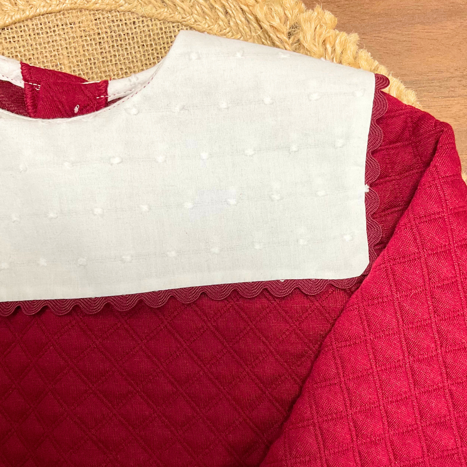 Pelele de vestir para bebé, modelo Uganda, confeccionado con una delicada combinación de tejidos que aportan suavidad, estilo y confort. La parte superior está realizada en plumeti burdeos 100% algodón, un tejido ligero y transpirable que aporta un aire fresco y clásico. Se combina con un tejido acolchado en tonos burdeos (97% poliéster y 3% spandex), que ofrece calidez y una textura suave, ideal para los meses más frescos.