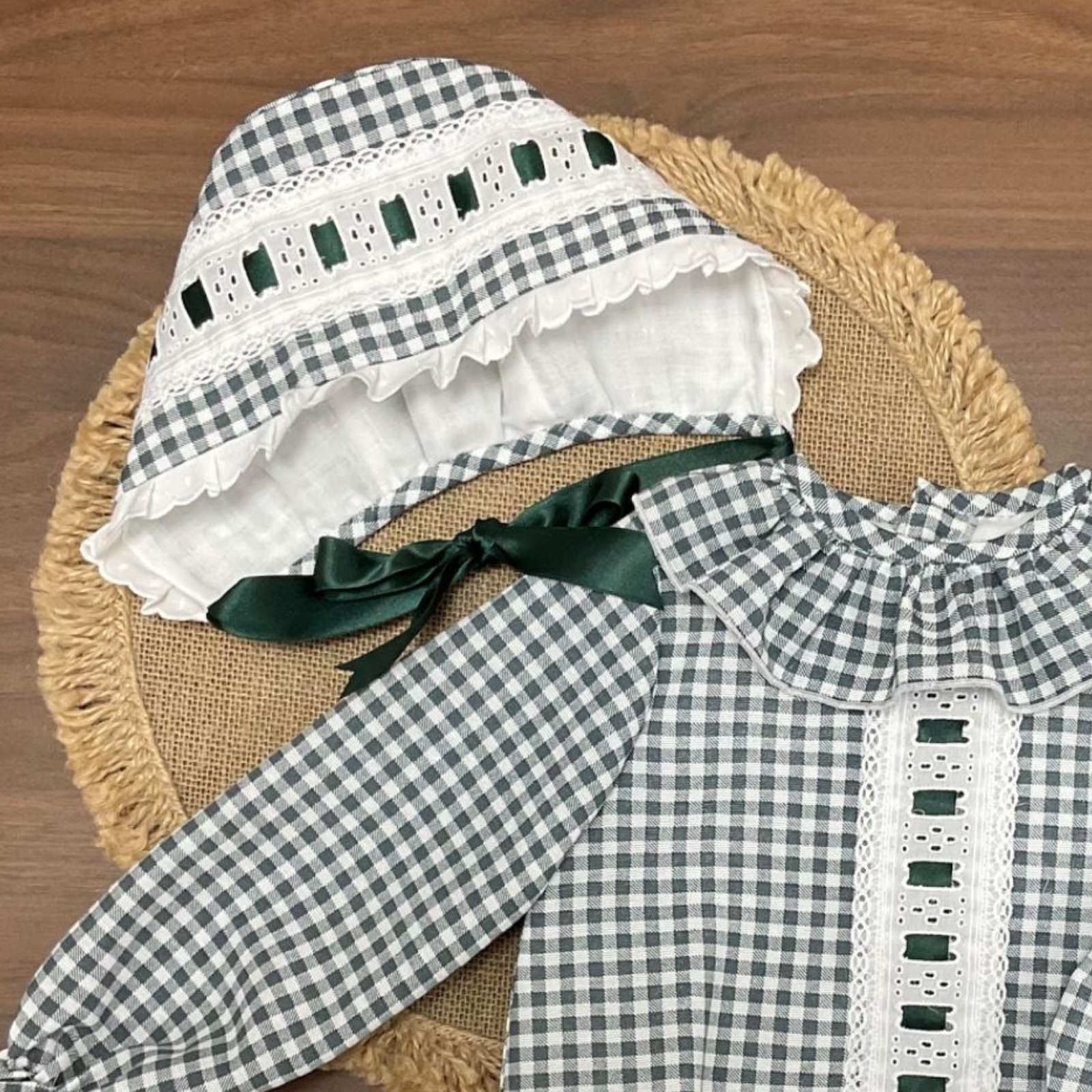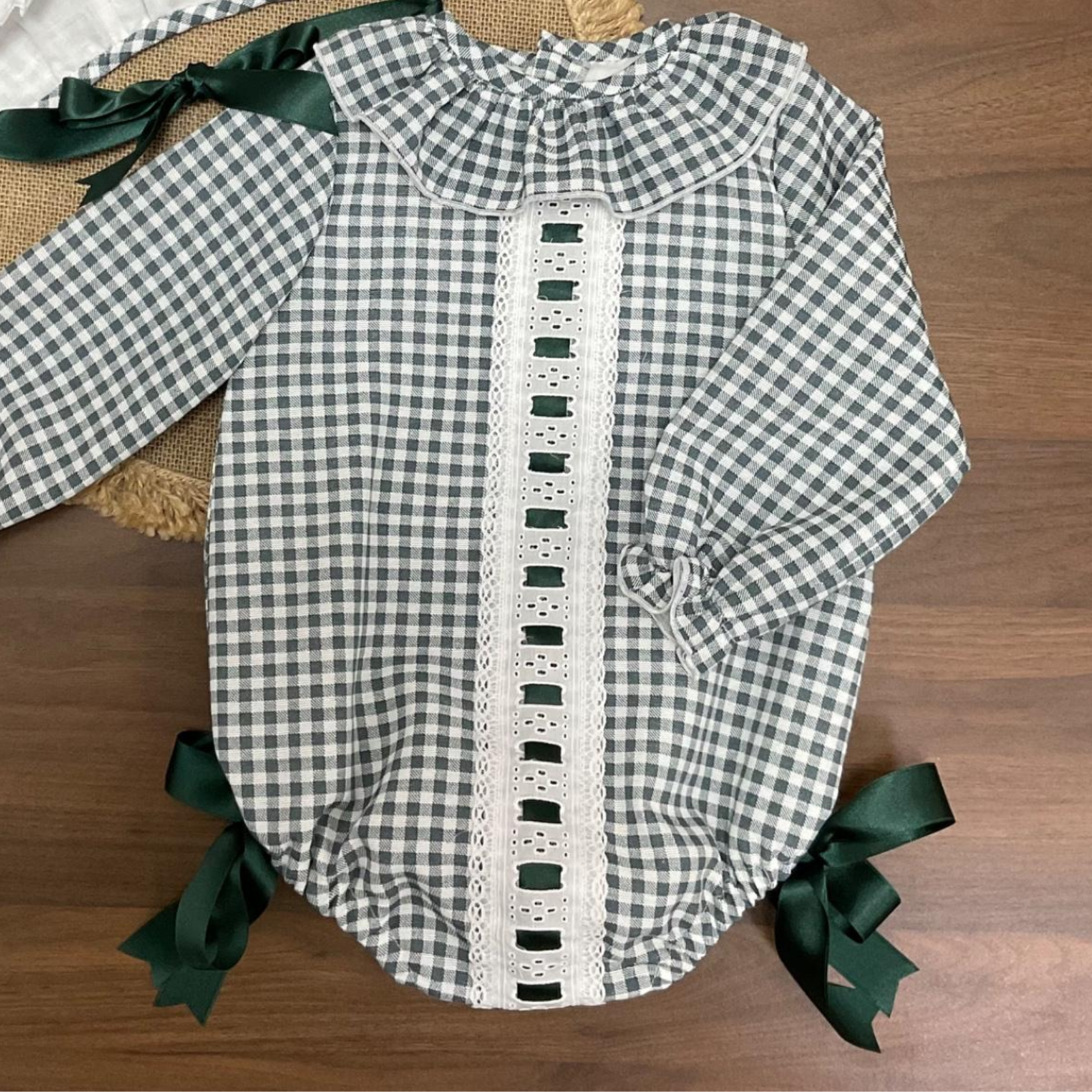 Pelele de vestir para bebé confeccionado en un suave algodón que presenta un diseño de cuadros vichy en tonos verdes. Tiene un corte cómodo y holgado, ideal para ofrecer libertad de movimiento. En la parte inferior, en los huecos de las piernas, se encuentran pequeños lazos decorativos que le dan un toque delicado y encantador. Los lazos están cuidadosamente colocados para agregar un detalle elegante sin restar comodidad. El pelele es perfecto para ocasiones casuales o más formales, aportando ternura y estilo a cualquier bebé.