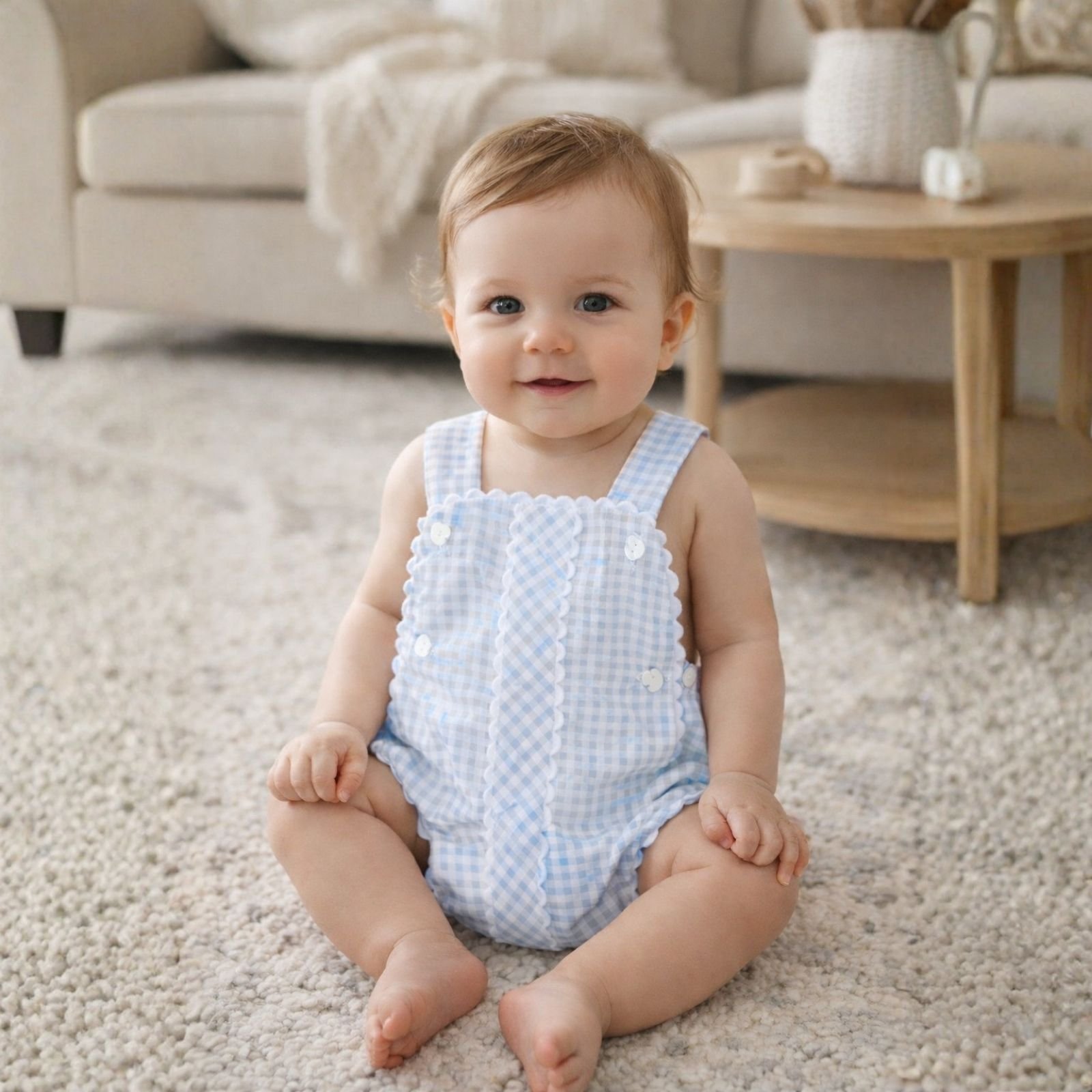 Encantadora ranita con tirantes confeccionado en suave tejido de cuadros vichy en tonos celeste y blanco.