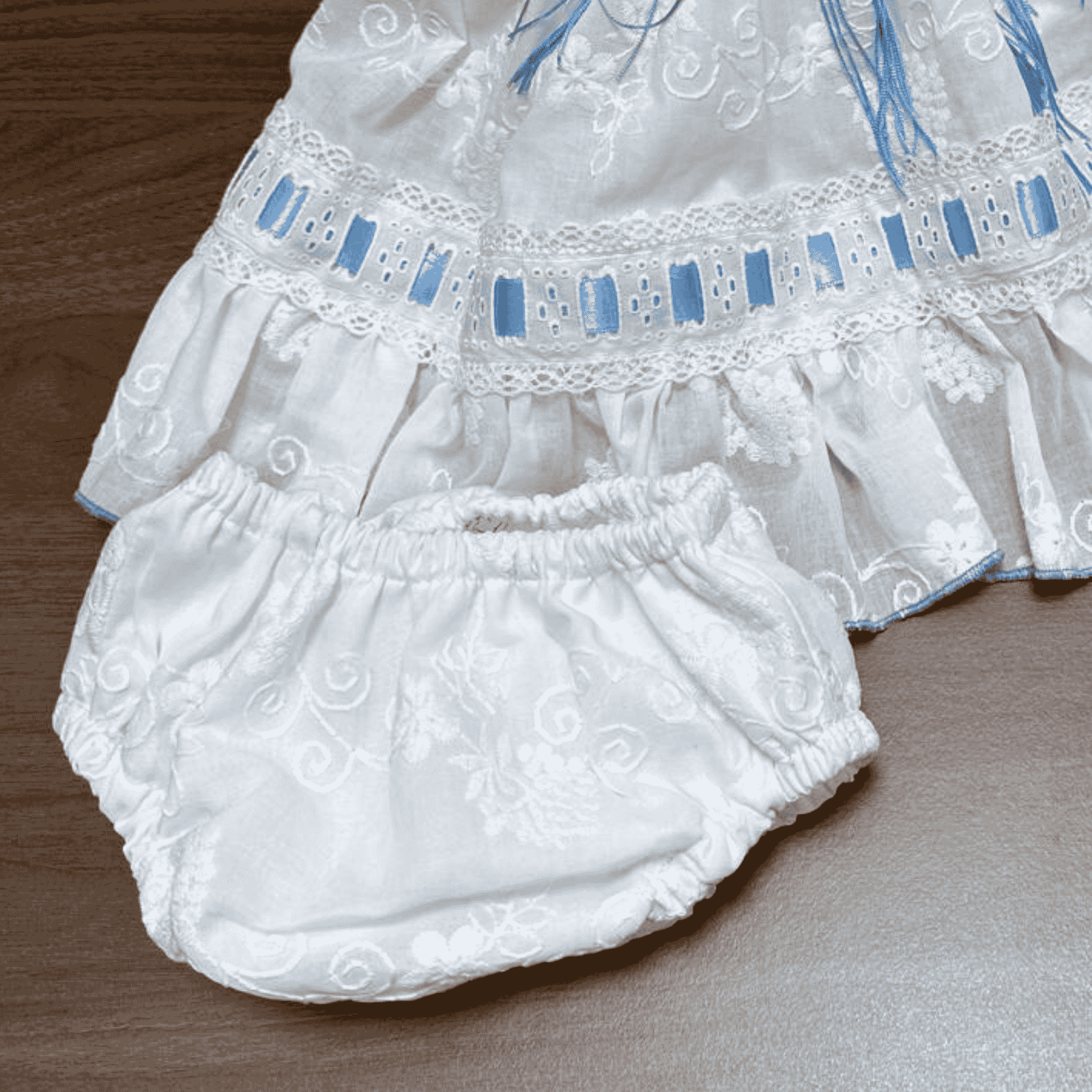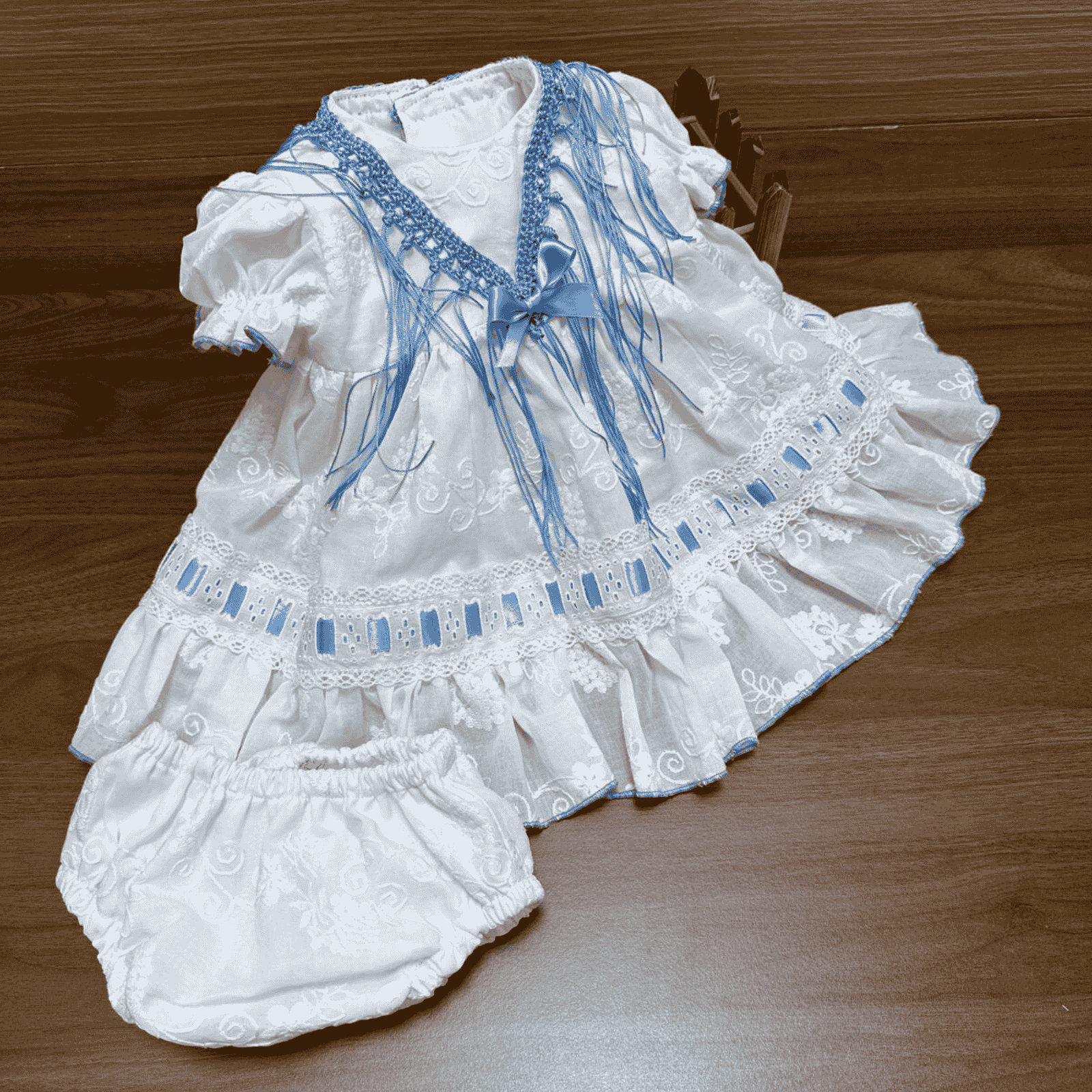 Vestido de flamenca con braga a juego en tejido perforado blanco. Cuenta con un volante en el hueco de la manga, adornado con un pasacinta celeste en el bajo del vestido, así como una picolina celeste al finalizar la falda. La parte del pecho cuenta con flecos celestes y un lazo.