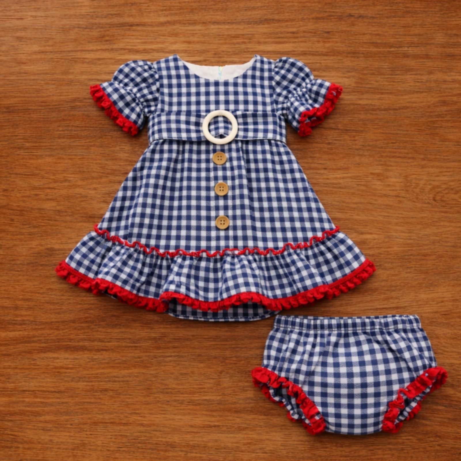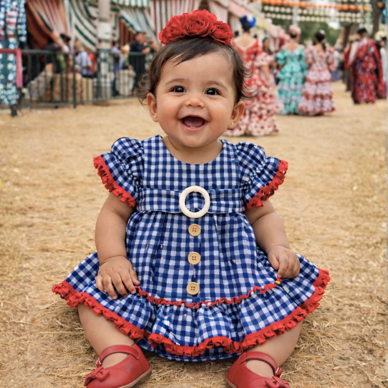 Traje de flamenca con tejido vichy azul marino y blanco, adornado con un cinturon del mismo tejido y tres botones de madera. Las mangas son de farolillo con elástico en el acabado. Los bajos acabados en un volante pequeño y otro más grande acabado en trensilla. Falda tipo canastera que aporta amplitud para andar y vuelo a la falda.