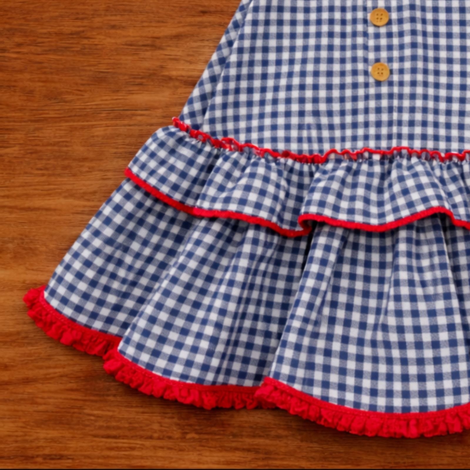 Traje de flamenca con tejido vichy azul marino y blanco, adornado con un cinturon del mismo tejido y tres botones de madera. Las mangas son de farolillo con elástico en el acabado. Los bajos acabados en un volante pequeño y otro más grande acabado en trensilla. Falda tipo canastera que aporta amplitud para andar y vuelo a la falda.
