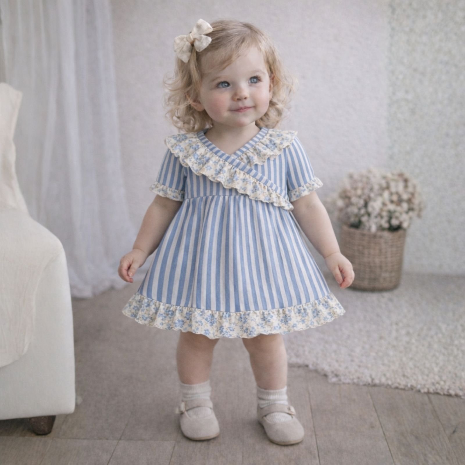 Este precioso vestido infantil combina a la perfección el encanto de lo clásico con un aire dulce y delicado. Confeccionado en un suave tejido de rayas azules y crudo, destaca por sus cuidados volantes en estampado floral, que aportan un toque romántico y muy especial al diseño.