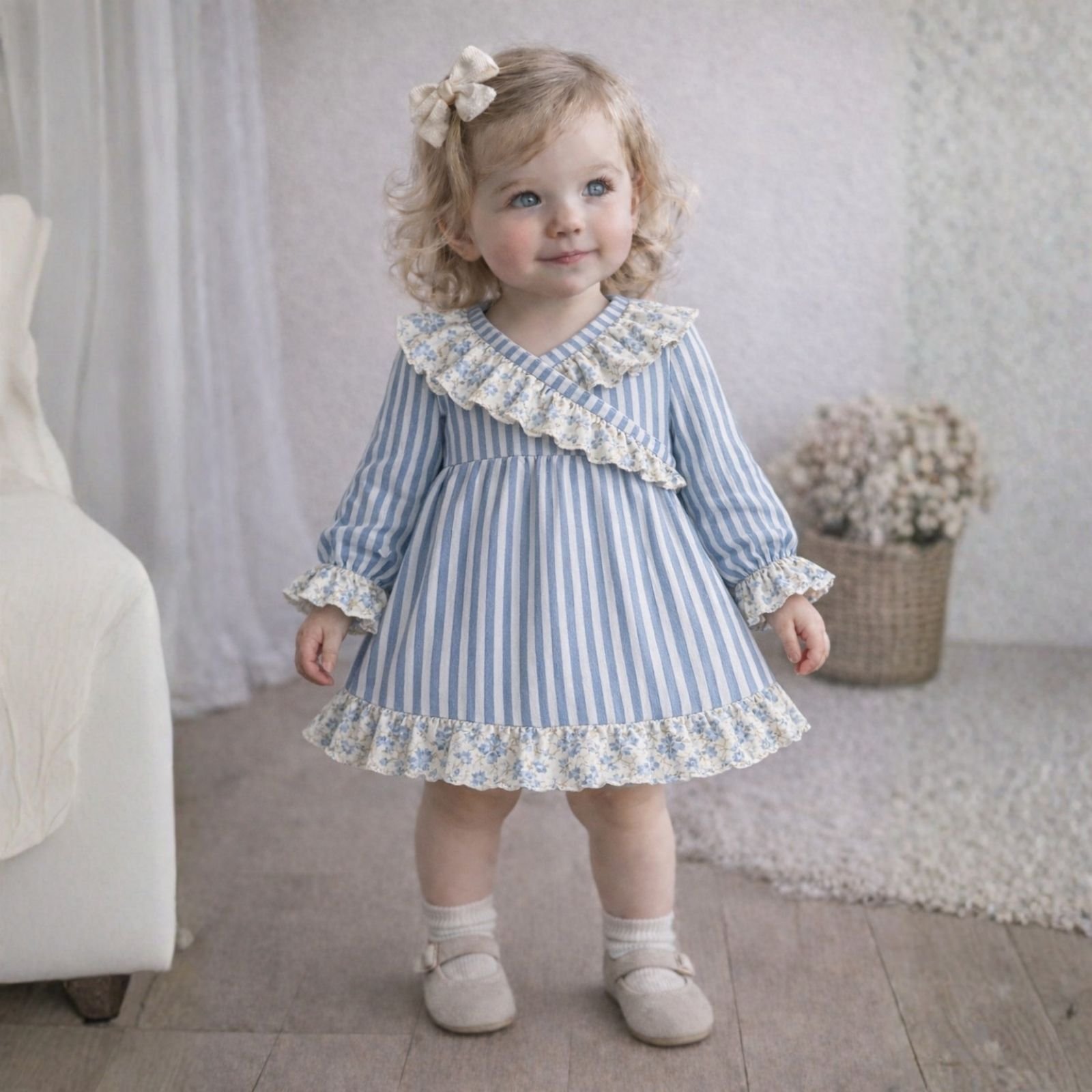 Este precioso vestido infantil combina a la perfección el encanto de lo clásico con un aire dulce y delicado. Confeccionado en un suave tejido de rayas azules y crudo, destaca por sus cuidados volantes en estampado floral, que aportan un toque romántico y muy especial al diseño.