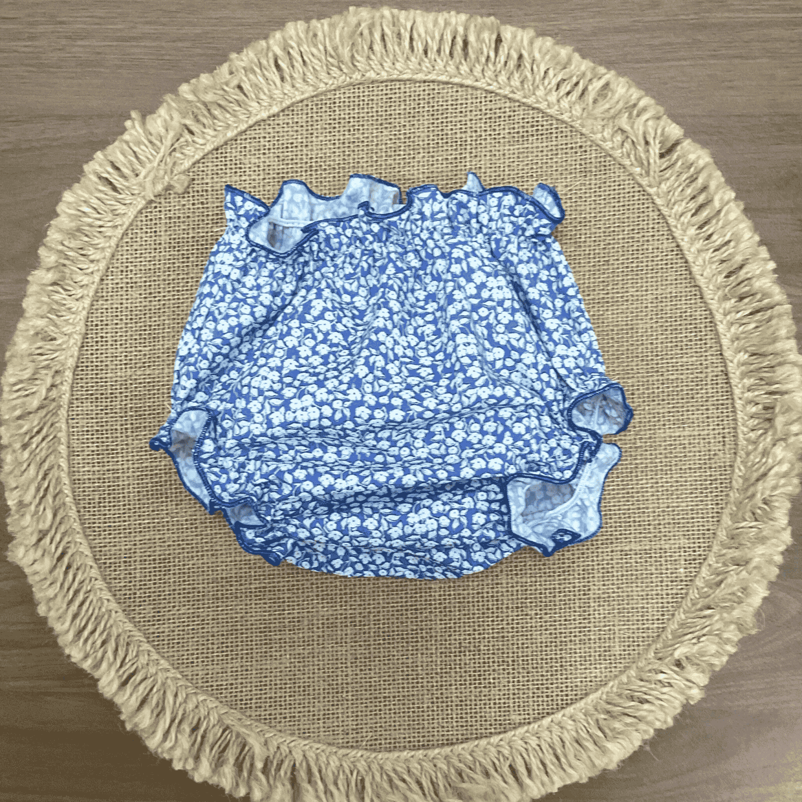Vestido y braga floral azul de manga corta, con manga y adorno en el pecho de plumeti remallados en azul. Abotonado en la espalda.